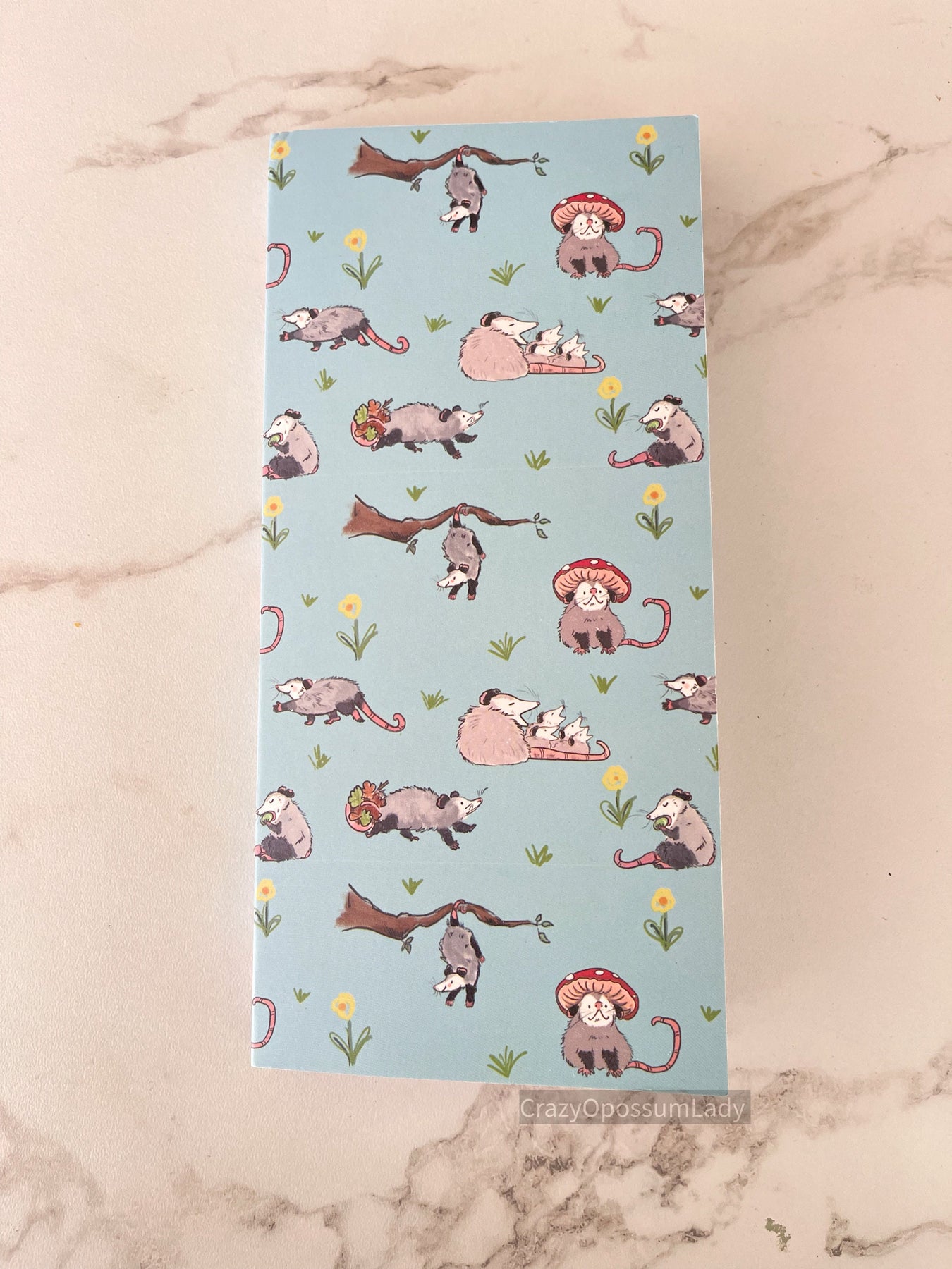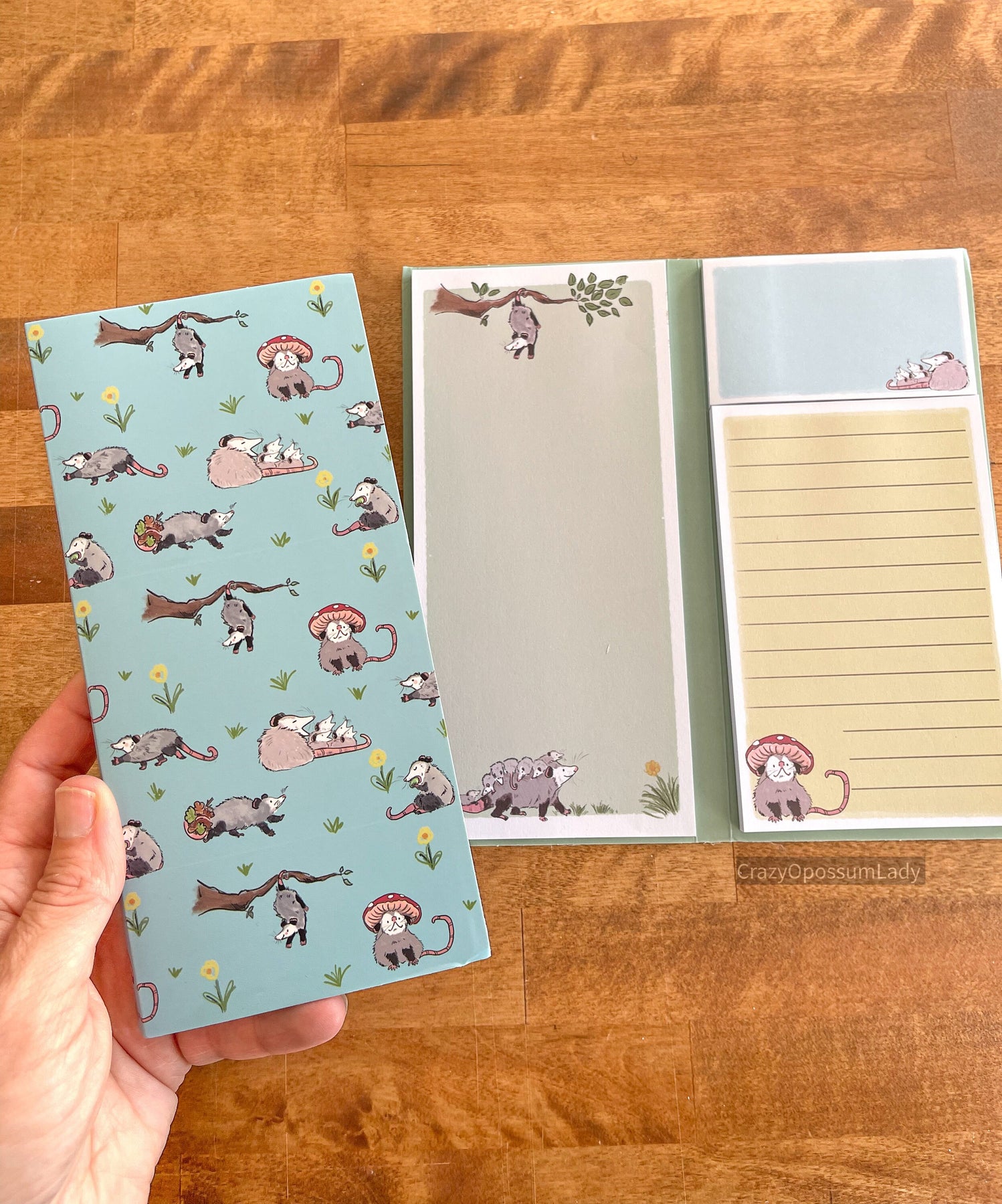 Introducing my brand new stationery collection — featuring pawesome illustrations of my all-time favorite opossums! Each piece is lovingly designed with high-quality details and a whole lot of possumality. Whether you're jotting down your to-do list or just doodling through the day, this set is un-fur-gettable! Snag the whole collection — they’re otterly adorable (wait... wrong animal, but you get the idea). Perfect for gifting — or keeping all to your-shelf (we won’t tell)! What’s Included: 1 large pull-away notepad (7.75” x 3.50”) — roomy enough for all your ‘impawsibly’ long lists! 1 medium lined pull-away notepad — because even chaos needs a little structure 1 sticky pad — for those quick “just ‘paws’ a sec” notes 150 sheets per book — that’s a whole lotta possums A printed opossum on each piece — because every note deserves a little trash panda charm Featuring illustrations of all my favorite opossums, each with their own special charm — from curious cuties to majestic marsupials.